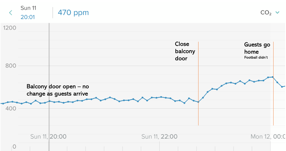 I bought a Netatmo Healthy Home Coach and put it under our TV to see if it was easy to monitor indoor ventilation. It turns out its very easy if you look at levels of carbon dioxide concentration. When people are in a room they take oxygen out of the air and replace it with water and CO2. By observing the CO2 levels in a room you can tell directly how well ventilated the space it. Luckily the response time from opening a window to seeing a decrease in the CO2 reading in my flat was much sharper than I would’ve guessed.